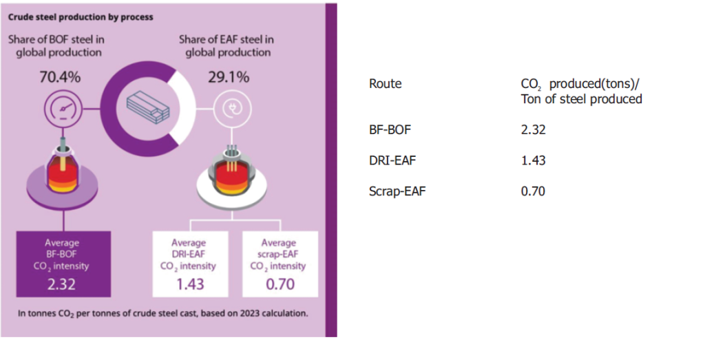 China 1005 Mt (1), India 149 Mt (2), Japan 84 Mt (3), US 80 Mt (4), Russia 71 Mt (5), South Korea 64 Mt (6), Germany 37 Mt (7) & Turkey 37 Mt (7), Brazil 34 Mt (8) and Iran 31 Mt (9) and rest of world 293 Mt [1]. China’s growth is incredible year over year. But India, in terms of steel making growth rates today, leads the top 10 largest steel producing countries by a wide margin. Carbon emission from steel making remains a major challenge today. India produces 2.54 tons of CO2 per ton of steel produced compared to the global average of 1.91 tons and 2.33 tons in China. India plans to achieve zero CO2 emission in its economy by 2070. Consequently India would achieve complete zero CO2 emission in its steel industry too by 2070. When the green transition of Indian steel industry is reviewed, the target of emission free steel making in India by 2070 is found challenging but realistic and the green transition of Indian steel industry highly promising. Carbon emissions from steel making depend on steel making route. The recent 2023 data is given below